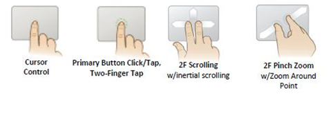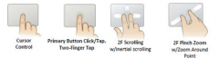 Touchpad pod Windows 8 de facto kopíruje funkce dotykového displeje, některé však interpretuje jinak, než jsme zvyklí – skutečně jej vnímá jako dotykovou plochu displeje, čili vedle výše uvedených funkcí, které fungují, jak bychom očekávali (viz. obrázek níže):