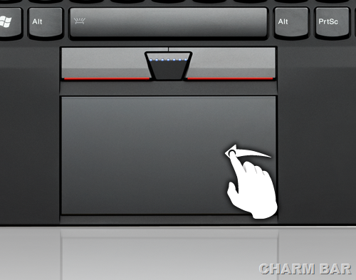 Tažením prstu z pravé hrany touchpadu docílíme zobrazení charm baru. Tažením prstu zleva zase přepínáme mezi aplikacemi a desktopem. Tažení shora tradičně zobrazí nabídku aplikace. Trošku komplikovanější (v porovnání s až návykovou jednoduchostí ostatních gest) je ukončení aplikace, kdy její horní hranu skutečně musíme fyzicky touchpadem uchopit, tedy nejčastěji na ni prostě dvakrát kliknout a táhnout zcela dolů.