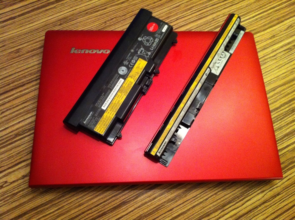 Nahoře: Pro porovnání baterie z S400 (32 Wh) a T420 (9článek 99 Wh). Myslím, že je jasné, která baterie patří ke kterému notebooku… Omlouvám se za kvalitu, ale mobilní telefon to bohužel lépe nezvládne.