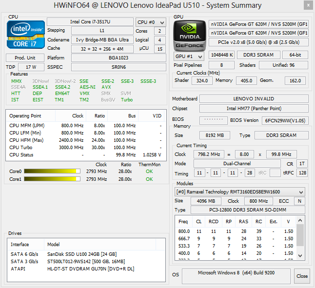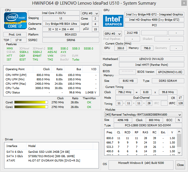 - 24GB mSATA Sandisk SSD + 500GB Seagate (5400 RPM, 16MB cache)