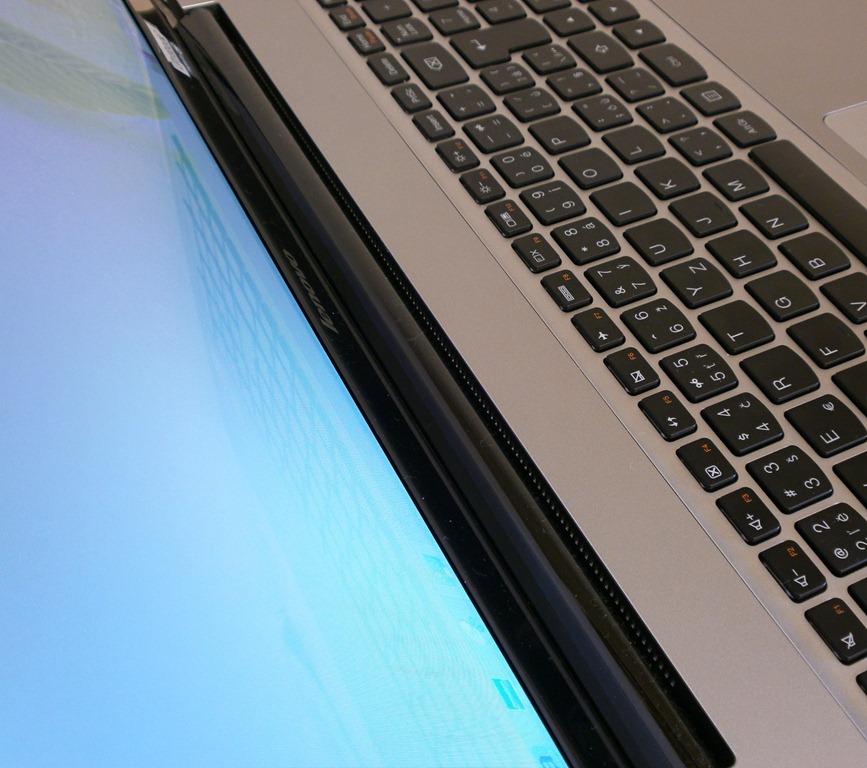 Podobne ako vonkajší povrch aj vnútro (resp. oblasť v okolí klávesnice a clickpadu) je matné, čo je nesmierne pozitívna vlastnosť, najmä pre “nepriateľov” odtlačkov, medzi ktorých patrím aj ja. Bohužiaľ v tomto ohľade nepoteší rám displeja, ktorý je lesklý, avšak väčším problémom ako sú odtlačky je prach, ktorý sa na lesklom povrchu pomerne pevne drží. Takže pre udržanie čistoty rámu U510 odporúčam nosiť so sebou mini handričku, v prípade, že prach nemáte moc v láske. Dobrou správou je, že na ráme nenájdeme žiadne vystupujúce gumy, a tak otieranie prachu, ktorý sa vám po dlhšej dobe nahromadí, je jednoduché.