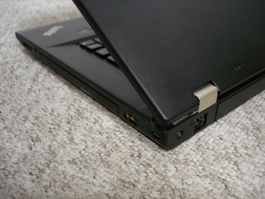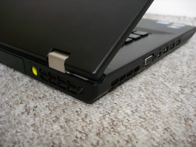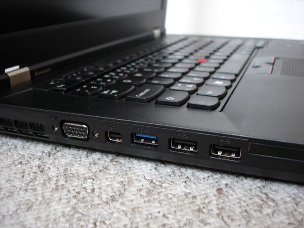 Na levém boku počítače se klasicky nachází drtivá většina konektorů – jsou zde hned tři konektory USB (dva USB 2.0 a jeden modrý USB 3.0), dále miniDisplayPort (sloužící v korporátním prostředí jako náhrada za HDMI) a klasika ve formě nesmrtelného VGA analogu. Na zadní straně je již tradičně nalevo konektor pro napájení, v pravém rohu se našlo místo pro ethernet. Na pravém boku počítače je kombinovaná čtečka paměťových karet, sdružený zvukový vstup/výstup 3,5mm jack, optická DVD mechanika, zdířka pro zámek notebooku a konečně poslední čtvrtý, žlutý konektor USB (ve verzi 2.0), který je napájen i při vypnutém počítači a lze ho tak použít například k nabíjení telefonu (lze vypnout). Po odejmutí baterie se ukáže malý slot na kartu SIM. Jako důležitý parametr pro firemní klientelu je přítomnost dokovacího konektoru, kompatibilního s běžnými ThinkPadími dokovacími stanicemi.