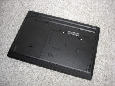 Zespodu je k rychlému odejmutí připraven pouze jeden velký kryt, přičemž jeho odejmutí se provádí povolením dvou šroubků a následným postupným „vylamováním“. Toto je běžná praxe u levnějších multimediálních zařízení, ThinkPadu to ale nedělá moc hezkou vizitku. Přes tento kryt se dostanete k několika komponentám, zejména k RAM a harddisku.