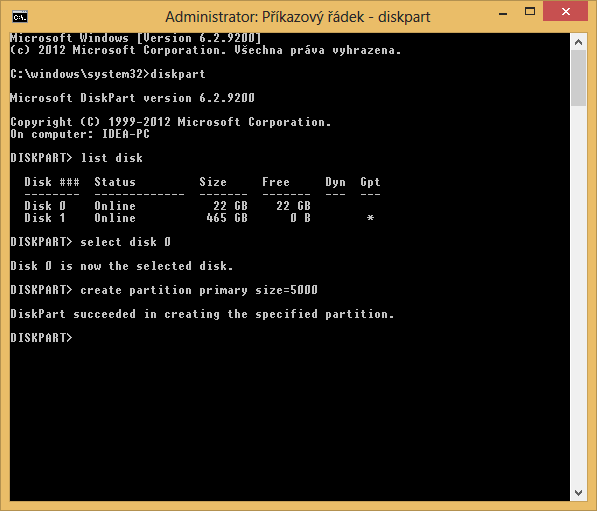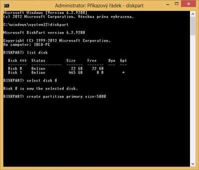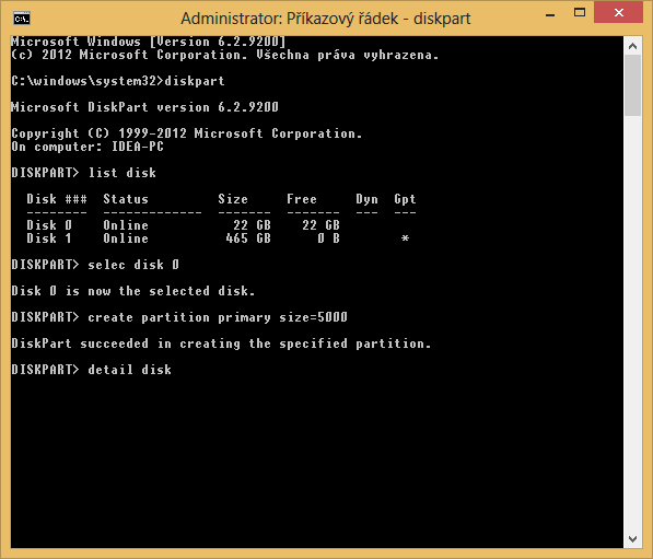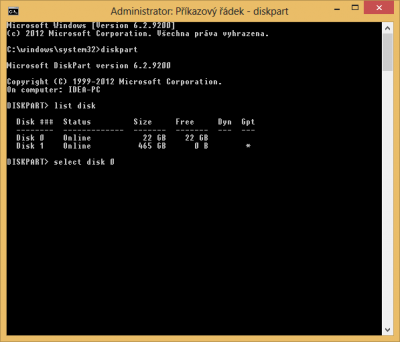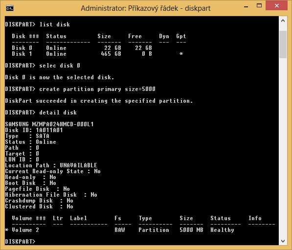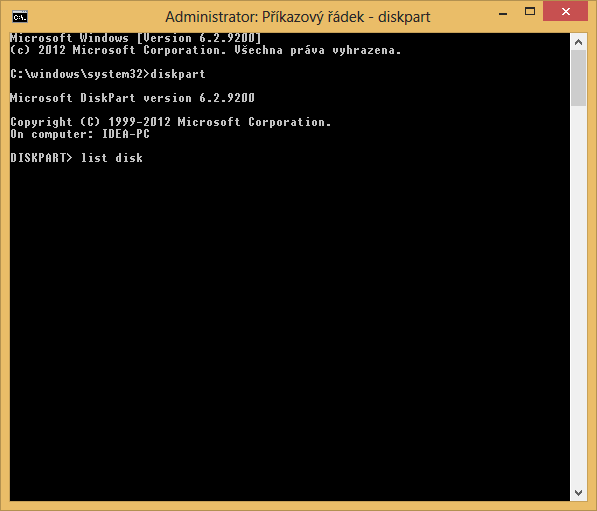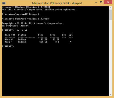 - Vypište si připojené disky příkazem DISKPART> list disk.