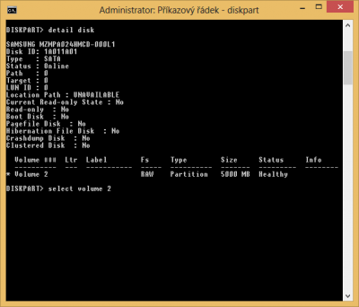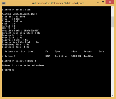- Příkazem DISKPART> detail disk vypíšeme oddíly na SSD disku.