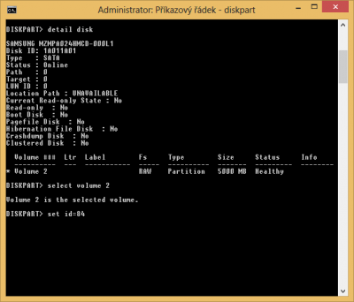 - Nastavíme novému oddílu id=84 (aby se jednalo o oddíl pro hibernaci a systém jej poznal) pomocí příkazu DISKPART> set id=84. Toto je velice důležité, jinak Rapid Start nemůže fungovat.