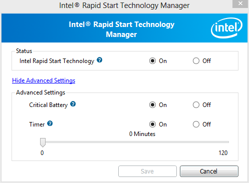 V ovládací aplikaci pro Windows (Intel Rapid Start Technology Manager) je možné technologii Rapid Start zapínat a vypínat, dále ještě nastavit několik možností: zda se Rapid Start (čili uspání systému na SSD) aktivuje při kritickém stavu baterie a také časovač – ten udává, jak dlouho notebook zůstane v režimu spánku, než se automaticky pomocí Rapid Start uspí na SSD.