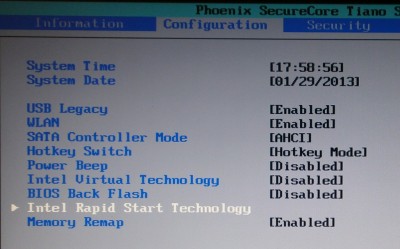 - V první řadě ovšem zkontrolujte, zda váš notebook technologii Rapid Start podporuje. Obecně se jedná o funkci dostupnou na noteboocích s procesory Intel Core třetí generace (Ivy Bridge) a Ultraboocích. Nejjednodušší je podívat se do nastavení BIOS, kde se volba Rapid Start bude nacházet (viz. níže BIOS U310):