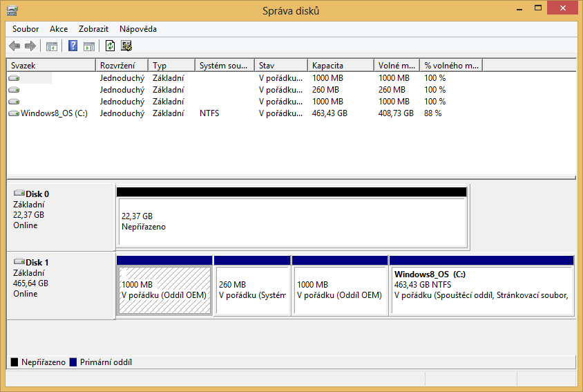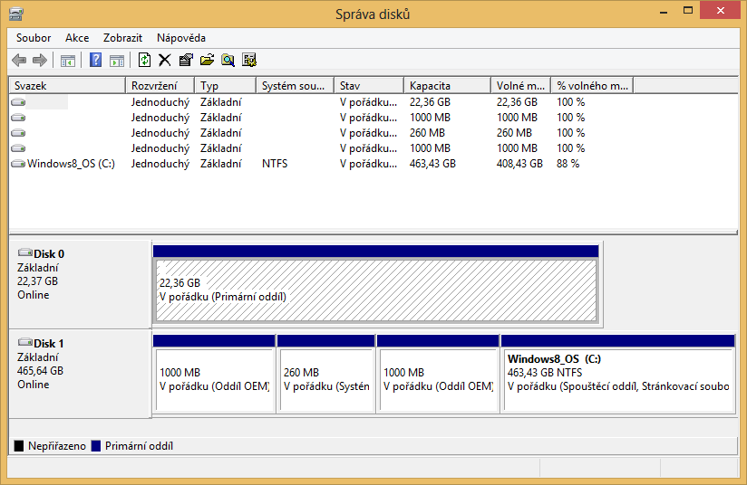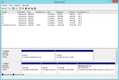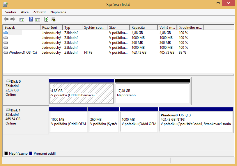 - Zkontrolujte ve správci oddílů a disků ve Windows, zda jste vše provedli správně – na mSATA SSD musí být vytvořený hibernační oddíl.