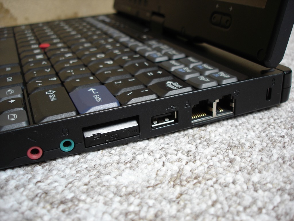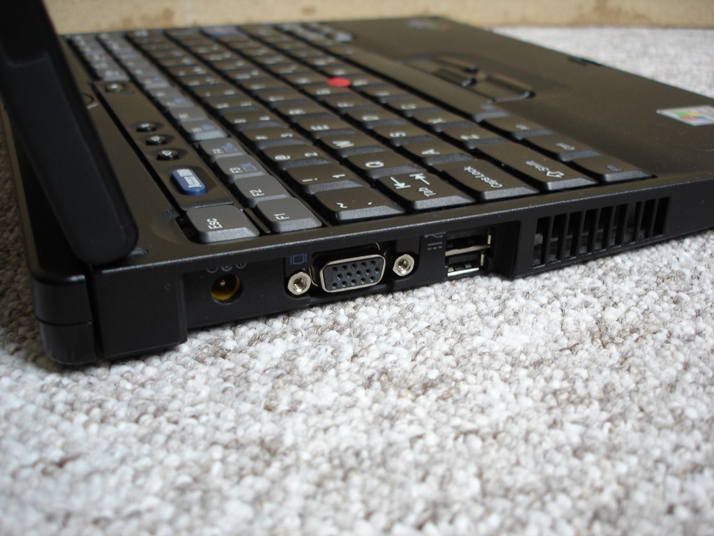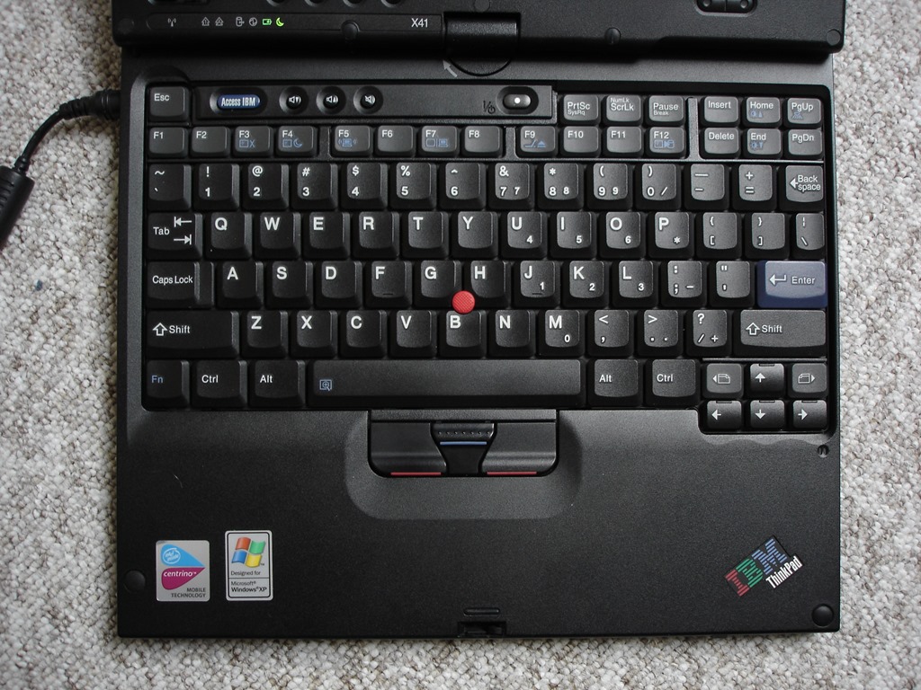 Klávesnice modelu X41T je velice podobná té na velké 14″ T41. Toho se dosáhlo drobným zmenšením všech kláves, smrsknutím horních bloků blíže k sobě a oříznutím po stranách. Oříznutí je však v důsledku dost nešťastné, protože maličký enter a přímo titěrný backspace dost znesnadňují psaní poslepu. Samotné psaní mi taky moc po chuti nebylo – tlačítka mají nepříjemný povrch, jsou při psaní dost hlasitá a mají na notebook až nezvykle hluboký stisk. Ačkoliv jsou vlastně z jedné řady, T41 má klávesnici výrazně pohodlnější. S klávesnicí jsem zkrátka bojoval, a určitě bych doporučil připojení některé externí. Zvláštností klávesnice jsou pak dva odtokové kanálky pro vodu, sloužící v případě polití jako záchrana hardwaru uvnitř notebooku. Ano, i takto staré ThinkPady již touto věcí disponovaly!