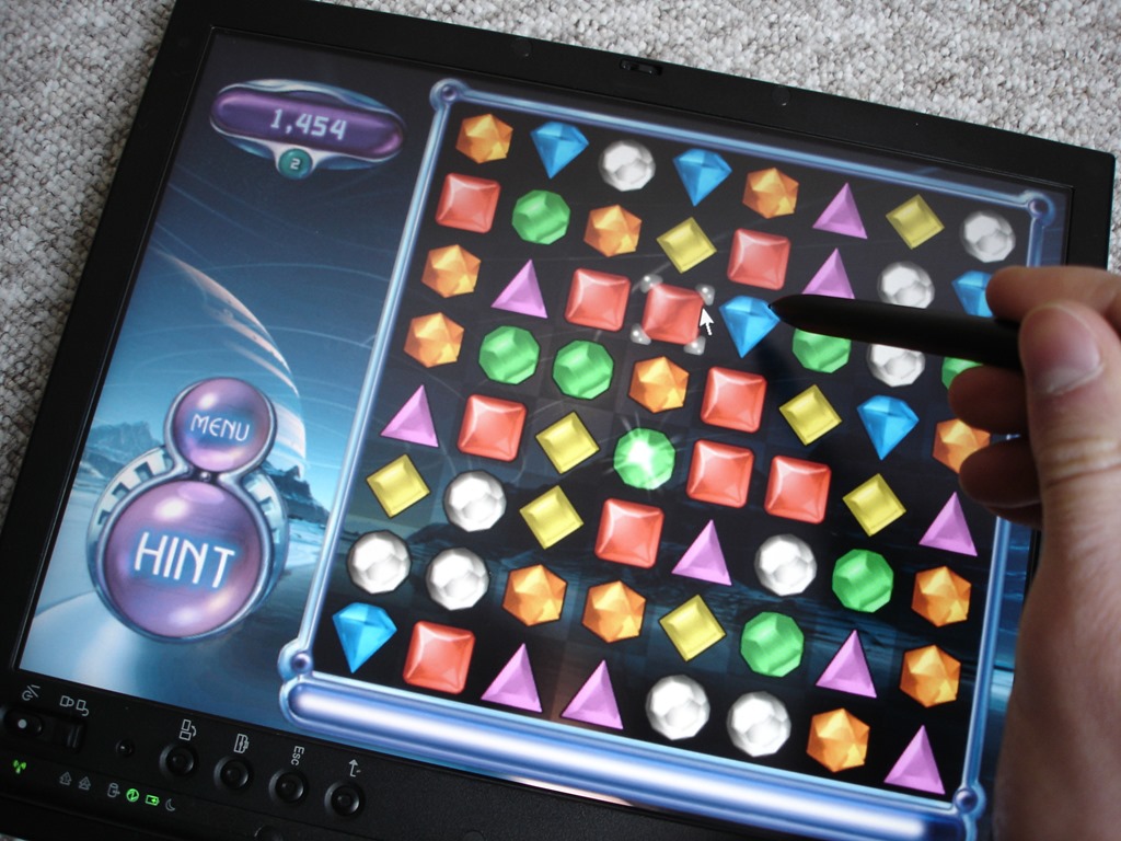 Jak lze vlastně dotykový displej využít? Hledáním odpovědi jsem strávil poměrně dost času. Hodí se na procházení webu (pokud zrovna nechcete psát), ovládání prezentací, malování, a… Pravda, moc produktivních věcí jsem nevymyslel. A tak jsem jako jedinou opravdu přínosnou vlastnost dotykového displeje našel trochu paradoxně hraní her – Moorhuhn, BeJeweled či Zuma se na dotykovém displeji hrají skutečně výborně, a je to i mnohem větší zábava, než s klasickou myší (vraťme se do roku 2005, kde si šéf nějaké veliké nadnárodní společnosti právě říká „Rád bych ovládal prezentace klientům tužtičkou, a hlavně bych si rád zahrál kamínky a střílení slepiček nějak pohodlněji… Koupím si IBM ThinkPad X41T za 50 tisíc!“).