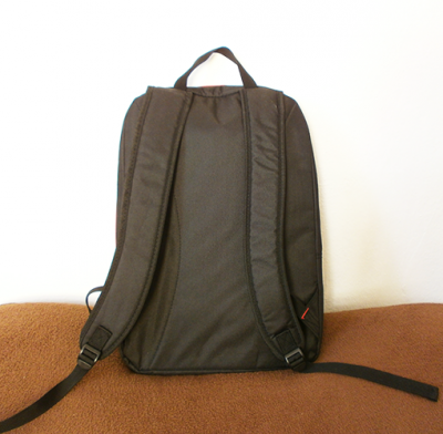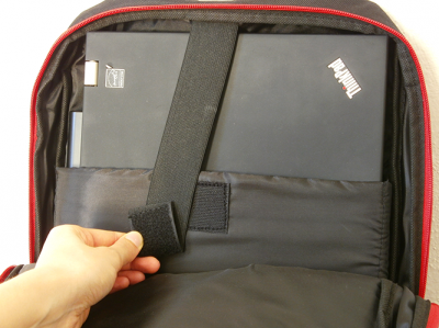 K dispozícii máte jednu kapsu, ktorá v sebe skrýva časť pre notebook a priestor pre vloženie dokumentov, prípadne príslušenstva, desiaty. Časť vyhradená pre notebook je polstrovaná, kde na povrchu je už zmieňovaný nylon a vo vnútri je určitý druh peny, ktorý má chrániť váš notebook pred poškodením. Mínus vidím vo veľkosti tejto vyhradenej kapsy, pri vložení 14” aj 15,6” notebooku 1/3 vytŕčala von a držal ju len popruh. A práve ten nie je najlepším výtvorom, pretože vzhľadom k jeho dĺžke (prípadne ku krátkosti suchého zipsu) neuchopuje notebook dostatočne pevne. Pri natiahnutí, ktoré by notebook lepšie zaistilo, ho už nemáte kde uchytiť (viz. obrázok). Zároveň zadná časť nie je vystužená, a tak celý batoh vystužuje iba notebook.