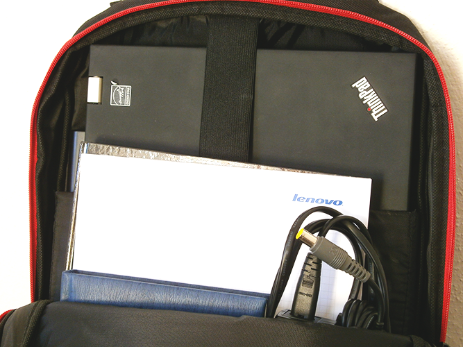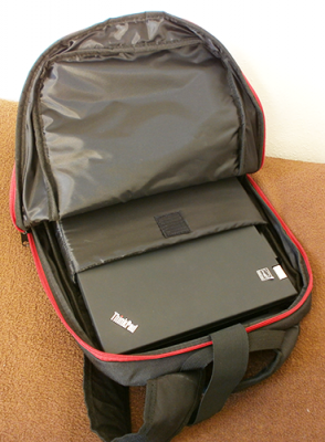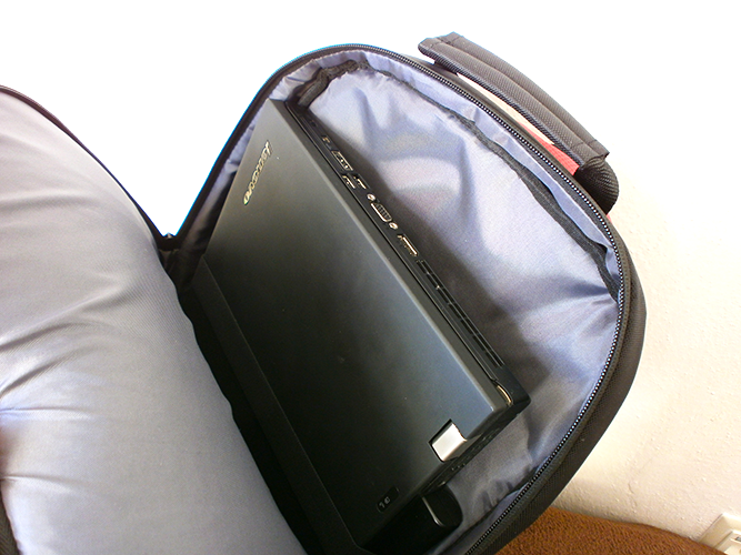 Pri skúšaní, aký notebook tieto batohy pojmú, sme využili klasický 14” ThinkPad T420 s 6 článkovou a 15” T520 s 9 článkovou batériou. Neodporúčali by sme tieto batohy pre notebooky s menšou uhlopriečkou.