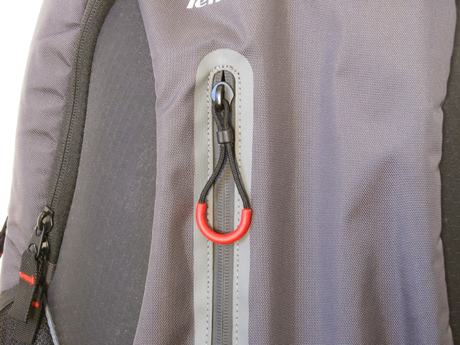 Zipsy sú klasické železné s látkovou časťou pre pohodlnejšiu manipuláciu, vždy po dvojiciach. V prednej kapse je viditeľný iný typ “zipsu” v tvare šnúrky spojenej pevnou plastovou časťou v strede a na konci pre pohodlnú manipuláciu v červenej farbe. Všetky zipsy sú robené nepremokavým spôsobom pre udržanie vášho notebooku a ostatných vecí v suchu a bezpečí.
