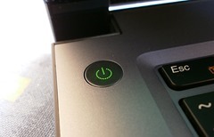 Hneď pri zapnutí si všimnete ďalšiu zmenu, ku ktorej patrí zelená farba indikačných diód vyzerajúca pekne v kombinácii so sivou farbou. Avšak pri zelených diódach na tlačidle zapnutia notebooky si nie som istá ich vhodným použitím, pretože je ťažie viditeľná na rozdiel od klasických bielych diód. M490s je k dispozícii nielen v sivom, ale aj v červenom a čiernom prevedení, a práve na poslednom bude tlačidlo so zelenými diódami vyzerať pravdepodobne najlepšie.