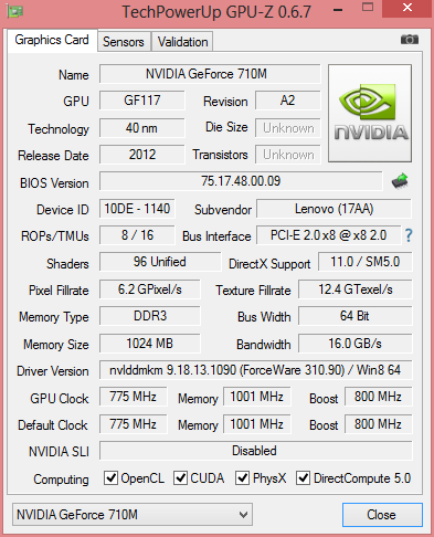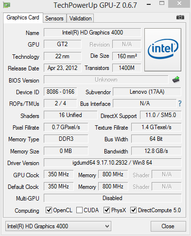 • Intel HD 4 000 + nVIDIA GeForce 710M (1 GB DDR3)