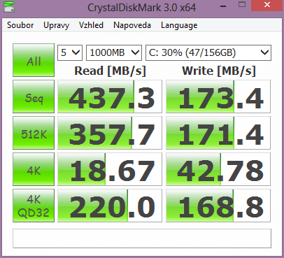 Okomentovat bych chtěl pouze výsledky CrystalDiskMarku, tedy testu přenosové rychlosti pevného disku. Čtení naprosto odpovídá našim dřívějším testům Intel SSD 520, nicméně zápis je znatelně nižší. Nevíme, co za tím stojí, nejspíš speciální firmware, který pro tyto disky Lenovo používá (jinak nejsou kompatibilní s heslem pevného disku).