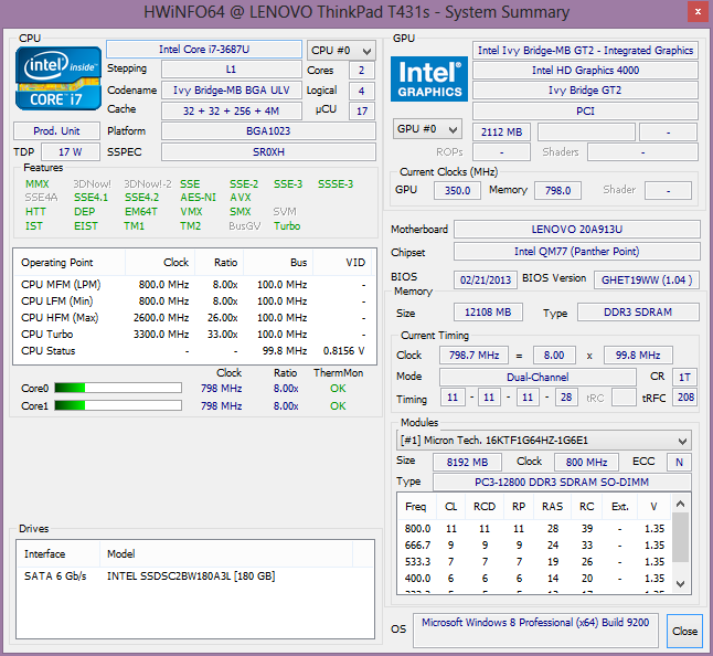 Základem ThinkPadu T431s je úsporná architektura ještě v generaci Chief River (pro fajnšmekry: proto má notebook označení T431s a ne T440s) s dvoujádrovým ULV procesorem Intel Core i7 Ivy Bridge a pracovní čipovou sadou Intel QM77 (zajištěna je tak podpory centrální správy Intel vPro). Na základní desce najdeme napevno připájené 4 GB RAM, v jednom běžném slotu jsme navíc našli 8GB kousek, čili celkem nabídl testovaný stroj 12 GB RAM v dvoukanálovém zapojení. Coby grafická karta logicky posloužila integrovaná Intel HD 4000. Svižnosti pak nasadil korunu disk Intel SSD 520.
