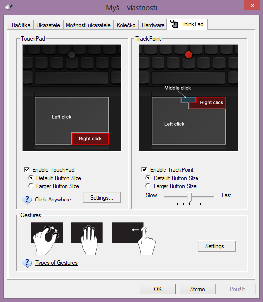 Touchpad i TrackPoint je možné jak v BIOSu, tak v ovladači vypnout. Po vypnutí touchpadu se zachová funkce TrackPointu i jeho tlačítek, dotyková plocha však poté neposouvá kurzorem, ale stále reaguje na gesta (otevření nabídky Charm, přepínání aplikací apod.), což považuji za krok správným směrem.