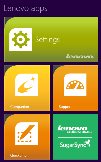 O softwarové výbavě ThinkPadů pod Windows 8 jsme psali už vícekrát, doporučím hlavně článek o nové aplikaci Lenovo Settings, která nabízí funkce z ThinkVantage Tools, které ve Windows 8 chybí, v ostatních směrech už zařízení spoléhá na nativní funkce v operačním systému. Předinstalované jsou neaktivované Office 2013, software pro práci s PDF Nitro a nástroje Lenovo (Support, Sugar Sync, Snip) v rozhraní Metro.