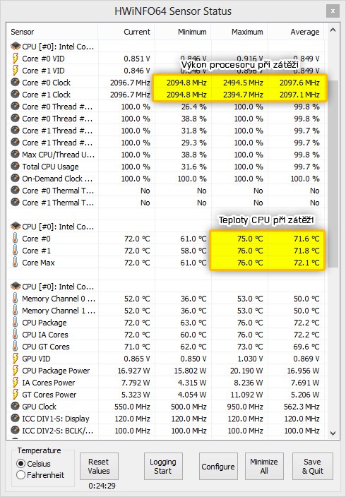 Ad teploty – na screenu jsou teploty BĚHEM ZÁTĚŽOVÉHO TESTU, nikoliv klasické.
