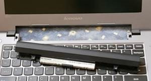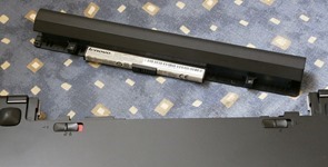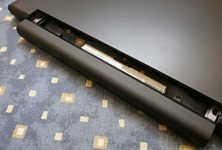 Veľmi zaujímavo je riešená batéria, ktorá má kosoštvorcový tvar vystupujúci v zadnej časti základne. Tento spôsob prevedenia vyzerá veľmi dobre a hlavne zaisťuje, že batéria nevystupuje vzadu z notebooku a je zarovno zo spodnou časťou. Dokonca vytvára štýlový kontrast s vekom pri zatvorení notebooku, pretože farba veka je o trochu tmavšia ako batérie. V kombinácii so svetlo-šedou farbou vnútra, vytvára trojicu šedých odtieňov, čo vyzerá veľmi elegantne.