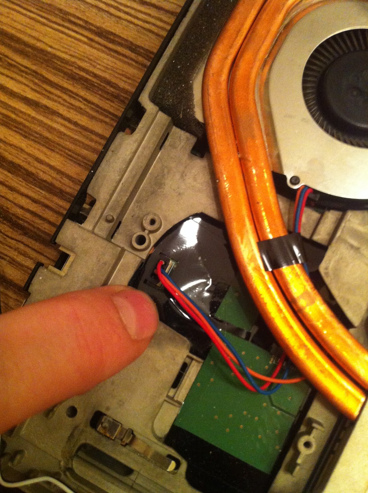 Konečně jsem se dostal k samotnému chlazení. Můžeme vidět ventilátor, heatpipe a heatsink na CPU. V tomto okamžiku si začneme dávat mnohem větší pozor. Odpojíme napájení ventilátoru.