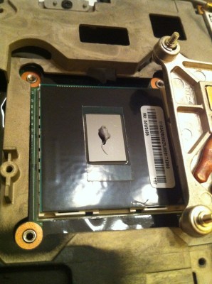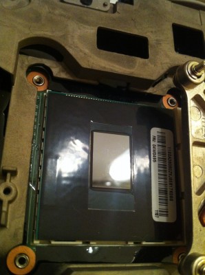 Na očištěný povrch aplikujeme přiměřené množství pasty. Musí jí být tak akorát, manuál udává 0,5 g (ale jak to chcete odměřit). Pro ilustraci se podívejte, kolik pasty dávám já. Je potřeba pastu rozetřít (někdo používá plast, třeba kousek staré platební karty, někdo používá prst v igeliťáku, osobně používám samotný heatsink. Spodní obrázek slouží jako důkaz že tolik pasty opravdu stačí (ono i zde platí, že všeho moc škodí).
