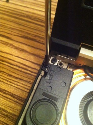 Oddělení LCD panelu. Každý pant drží na dvou šroubcích (jeden z vrchní strany, ten druhý, co je vidět na předešlé fotce, a druhý zespodu těla notebooku).