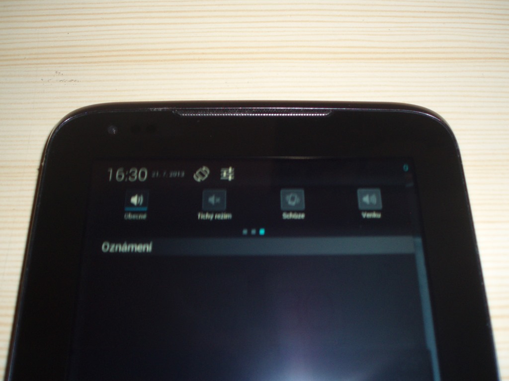 Dostáváme se z mého pohledu k největší slabině tabletu. Displej je typu TN, což znamená, že pozorovací úhly jsou průměrné. Velká většina notebooků je dnes vybavena TN displejem, což bývá notebookům vyčítáno především v dražších konfiguracích. U notebooku to ale nepředstavuje tak zásadní problém, protože se na něj většinu času díváme z jednoho, skoro ideálního úhlu, do kterého si notebook nebo spíš jeho displej prostě nastavíme. U tabletu toto neplatí, displej máme neustále v ruce, pořád s ním pohybujeme a vnímáme změny barev, které jsou pro TN displeje typické. Mě osobně to prostě vyrušovalo. Tento pocit se umocní v okamžiku, kdy začneme hrát nějakou hru, která se ovládá přes gyroskop tabletu natáčením přístroje.