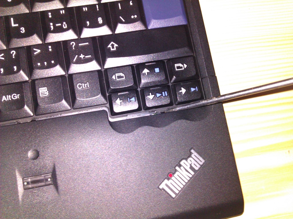 6) Klávesnici posuneme směrem k pantům displeje plynulým a plošným tlakem po celé klávesnici, případně si dopomůžeme plochým šroubovákem (doporučujeme však pouze tlak a posunutí velkou plochou dlaní – šroubovákem riskujete ohnutí nebo poškození klávesnice či opěrek zápěstí).