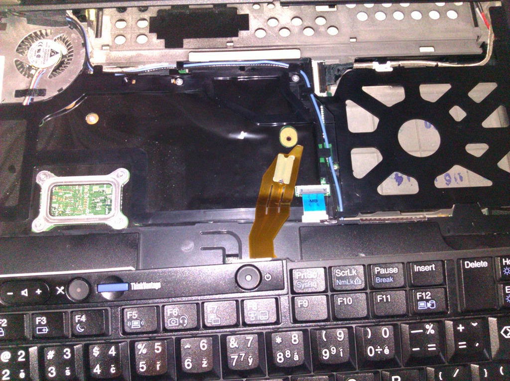 7) Když klávesnici „vypáčíme“, dáme si pozor a neděláme s ní prudké pohyby, protože je s notebookem stále spojena plochým kabelem se základní deskou notebooku!