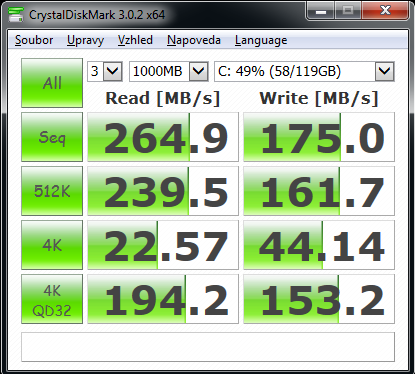 Co se týká přenosových rychlostí u mSATA Crucial SSD, tak čtení je velmi rychlé, prakticky nad hranici mého vnímání (řekněme, že rychlostí nad gigabitovou linkou už nevyužívám pro práci s velkými soubory). Zápis je už horší, kdy se mi z disku podařilo v reálu dostat asi 65MB/s, byť benchmark ukazuje v podstatě papírové parametry. Notebook je s diskem neuvěřitelně rychlý a odpadá problém, kdy je HDD zaměstnán jednou činností (třeba antivir něco kontroluje) a disk, potažmo počítač je v tu chvíli nepoužitelný pro druhý úkon. Přikládám jednoduchý benchmark.