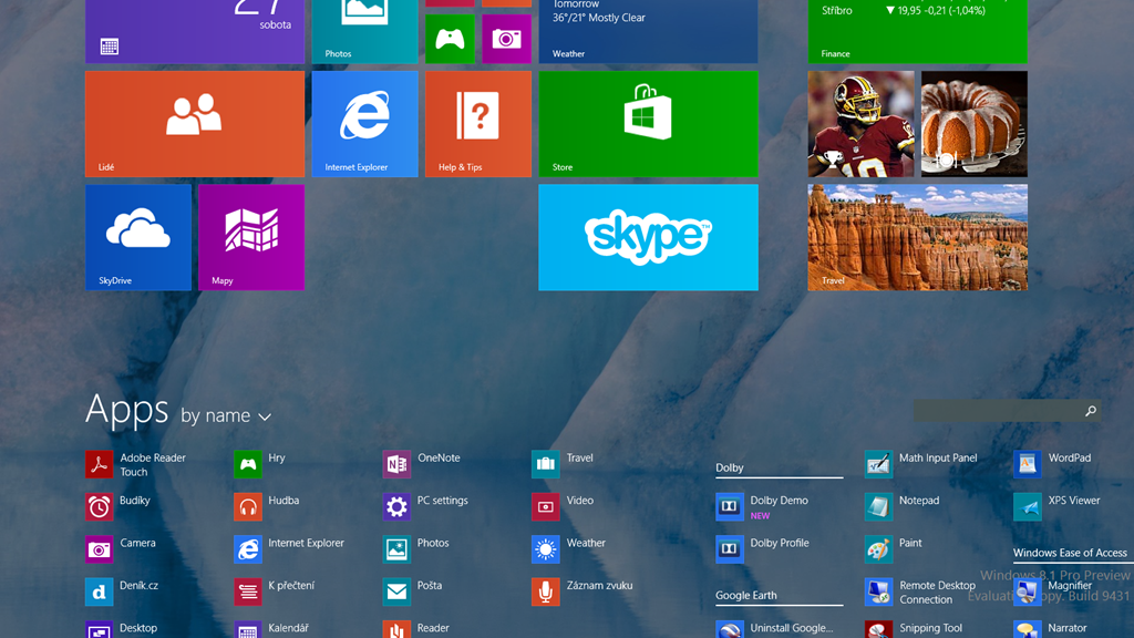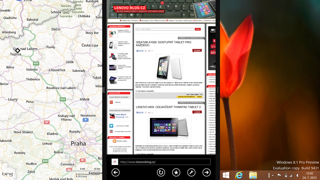 Již na první pohled a především dotyk bylo znát, že si chlapci v Redmondu dali tu práci a doladili dotyková gesta zejména v oblasti okrajů monitoru. Přepínání mezi aplikacemi se mi zdá podstatně plynulejší a hlavně intuitivnější. Designových a funkčních změn je hned několik: nové velikosti dlaždic (čtvrtinová a čtyřnásobná velikost), možnost libovolného pozadí v nabídce Start, více než dvě aplikace metro vedle sebe a jejich plynulé přizpůsobování rozměrů (hlavní výhodou oproti minulé verzi je možnost využití standardního desktopu, i pokud se z větší části dělí o obrazovku s Metro aplikací). Mohu tak psát ve Wordu a listovat v PDF souboru za pomocí dotykové obrazovky. Nezdá se to, ale opravdu to značně usnadní práci s více dokumenty najednou. Co bych za tuto funkci dal, když jsem psal o zátěžových testech na ThinkPadech, kdy jsem měl podklady v PDF souboru a vytvářel z nich článek na desktop aplikaci redakčního systému.