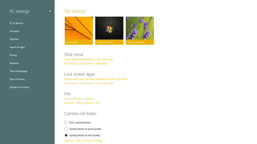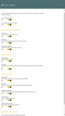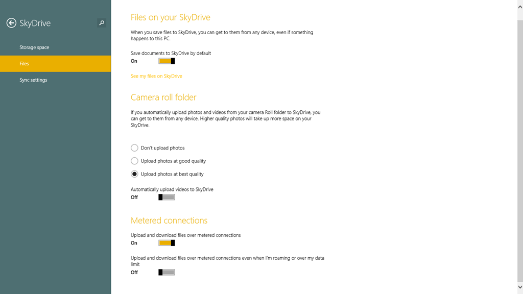 Služba SkyDrive je provázána s celým systémem a její priorita je zálohovat vaše fotografie, dokumenty a nastavení. Ve zkratce se služba snaží šetřit místo především na přenosných zařízeních s SSD disky (typicky tablety), kde se bojuje o každičký MB volného místa. Perfektně rozebraná funkce SkyDrive je na blogu Microsoftu (zde).
