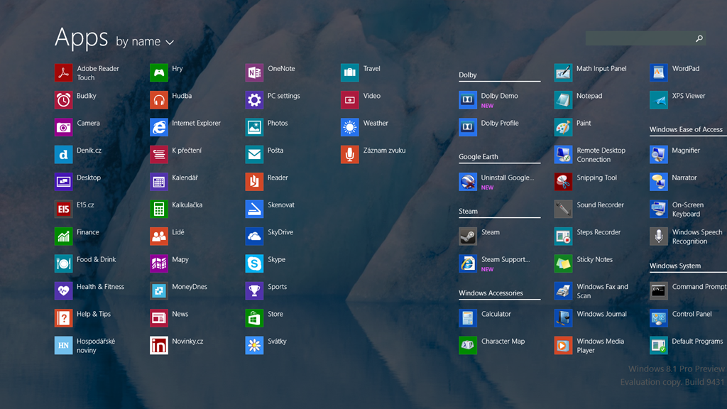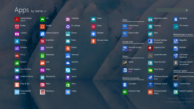 Jednou z nejdůležitějších inovací v nabídce Start je možnost zobrazení všech nainstalovaných aplikací hezky do jedné nabídky a možnost seřazení podle jména, data instalace, četnosti používání a podle jednotlivých kategoríí. Všechny aplikace navíc zobrazíme pouhým tažením prstem, nemusíme tak kvůli tomu klikat na speciální tlačítko.