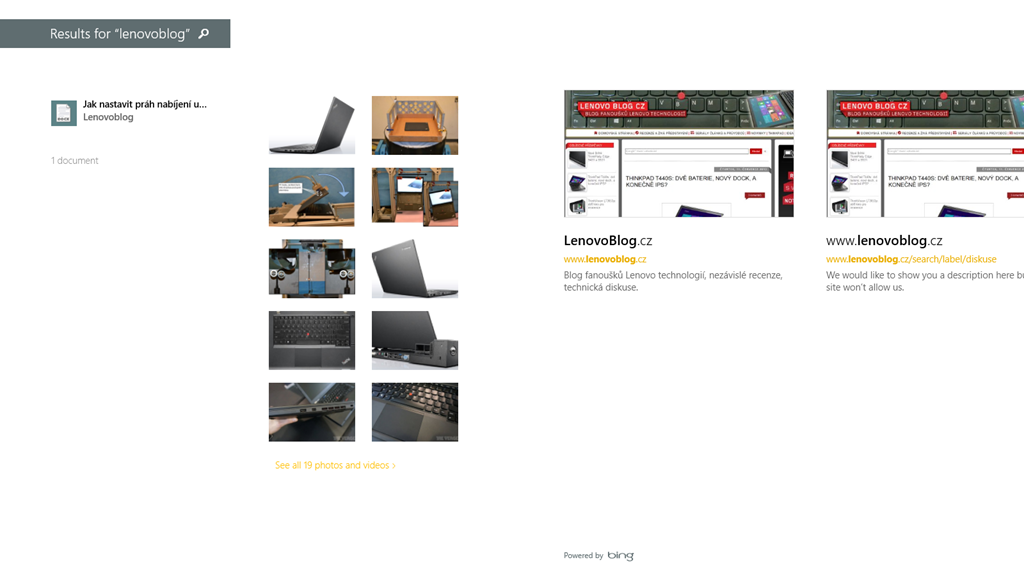 Značnou dávku inovací zaznamenalo vyhledávání skrze celý systém, SkyDrive a Bing. Díky jednotnému vyhledávání stačí zmáčknout Start a začít psát požadavek. Při zadání “lenovoblog” mi vyhledavač nabídl dokumenty a fotografie z pevného disku vč. SkyDrive a také výsledky hledání ze služby Bing.