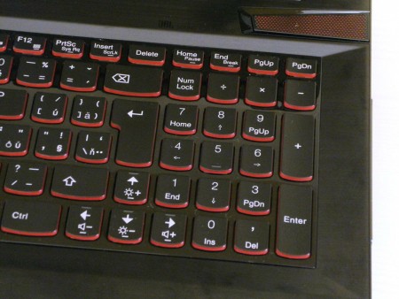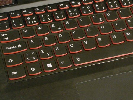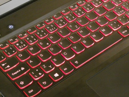 Klávesnice je na první pohled stále stejná jako u předchozího modelu a taky je dobře známá z téměř všech IdeaPadů posledních dvou generací, jen oproti některým disponuje podsvícením. Podsvícení je možné regulovat ve dvou stupních jasu a má červenou barvu, která sice velmi ladí s celým designem notebooku, ale na můj vkus je to celkem agresivní. Jedná se o upravenou klávesnici typu „AccuType“, píše se mi na ní dobře, odezva je příjemná, poměrně jistá. Klávesy jsou ergonomicky tvarované ve stylu Lenova.