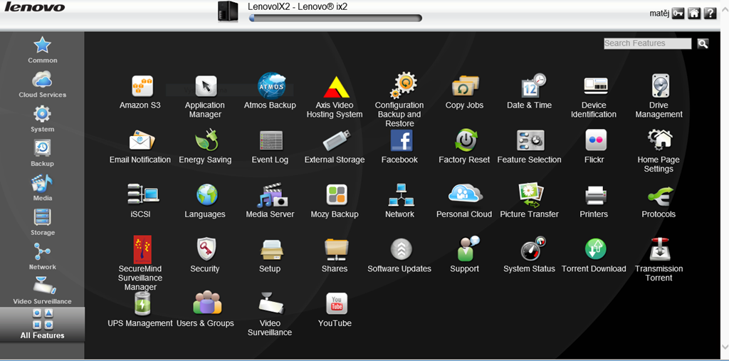 Správa Lenovo NAS serveru probíhá ve většině případů přes webové rozhraní, které je shodné pro EZ i IX2, snímek viz. níže. Rozhraní je poměrně přehledné, mohlo by být o něco rychlejší, ovšem IX2 přeci jenom je i v tomto ohledu mírně svižnější, ale ne výrazně. Velkou nevýhodou pro domácí uživatele je fakt, že rozhraní není česky.