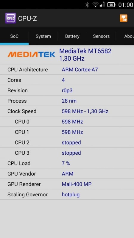• procesor: čtyřjádrový MediaTek MT6582 (1,3 GHz, Cortex-A7)