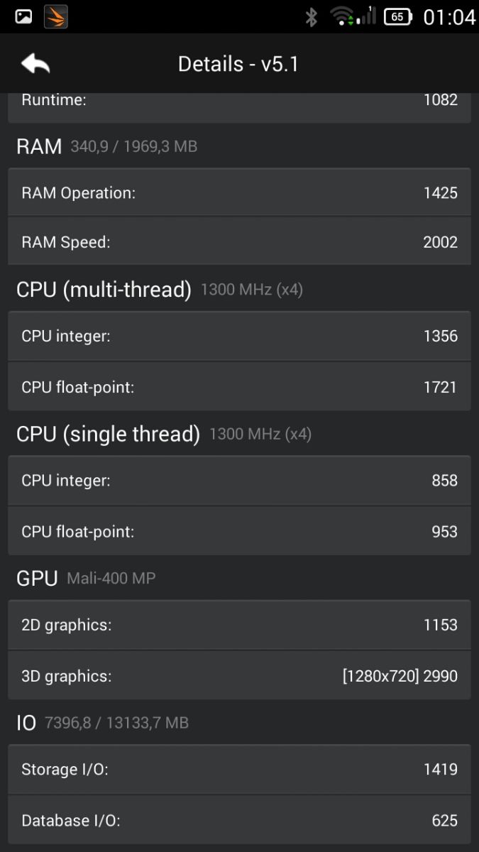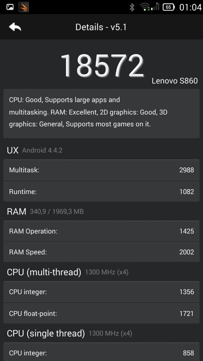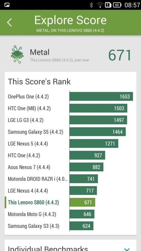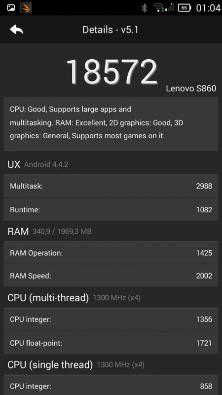 Telefon jsme podrobili benchmarkům AnTuTu a Vellamo, 3D mark se nám bohužel na S860 nepodařilo spustit. Porovnání výsledků benchmarků s jinými telefony většinou ukazuje na spíše podprůměrný výkon v rámci cenové kategorie.
