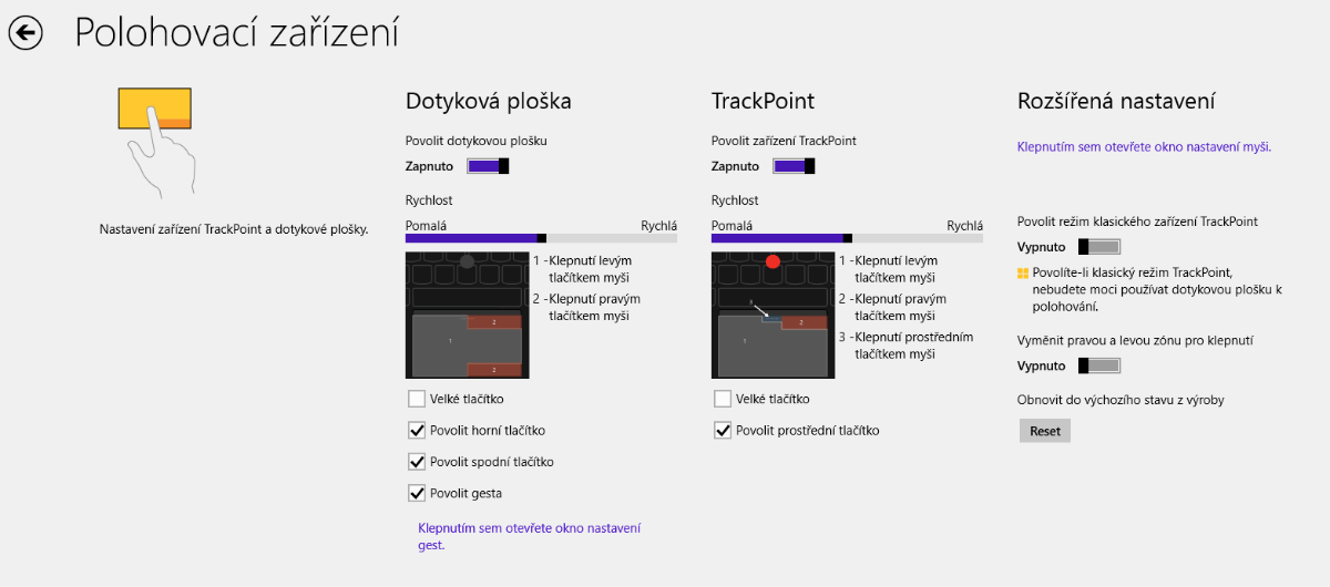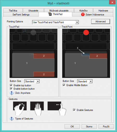 Toto chování nový ovladač mění, protože dává uživateli možnost nastavit pro režim touchpadu jak spodní zónu pravého tlačítka, tak horní, tedy pro pravý klik můžete nově používat jak pravou spodní, tak pravou horní (tedy TrackPoint) zónu. Uživatelům, o kterých píši v předchozím odstavci, by tato změna měla přijít vhod (ač já ji příliš neocením, protože používám režim klasického TrackPointu, kdy je touchpad neaktivní).