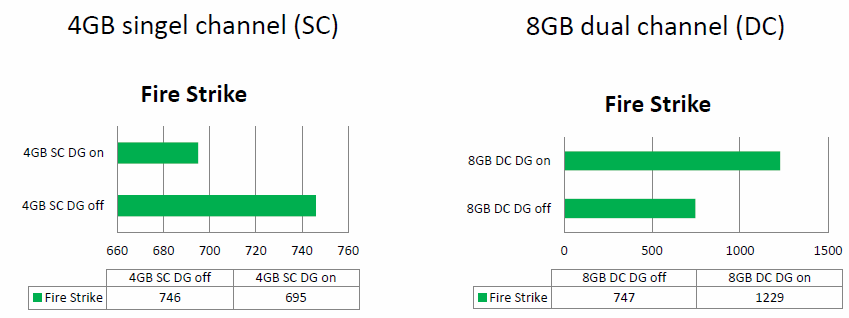 Bez dvoukanálového zapojení totiž po aktivaci AMD Dual Graphics nastane paradoxní situace, kdy výkon oproti režimu jedné grafiky poměrně výrazně klesne. A může klesnout i pod úroveň výkonu jedné grafiky, protože budeme samozřejmě operační paměť dusit a ta nebude schopna dostatečně rychle odbavovat požadavky grafik (64bitová sběrnice jednoho kusu RAM prostě nestačí).