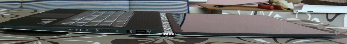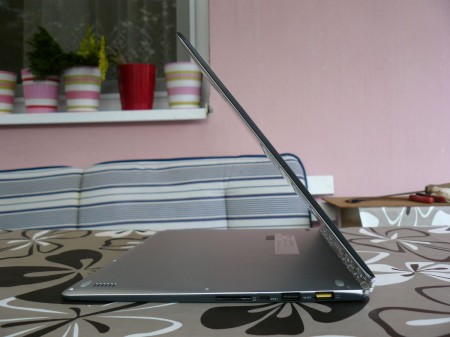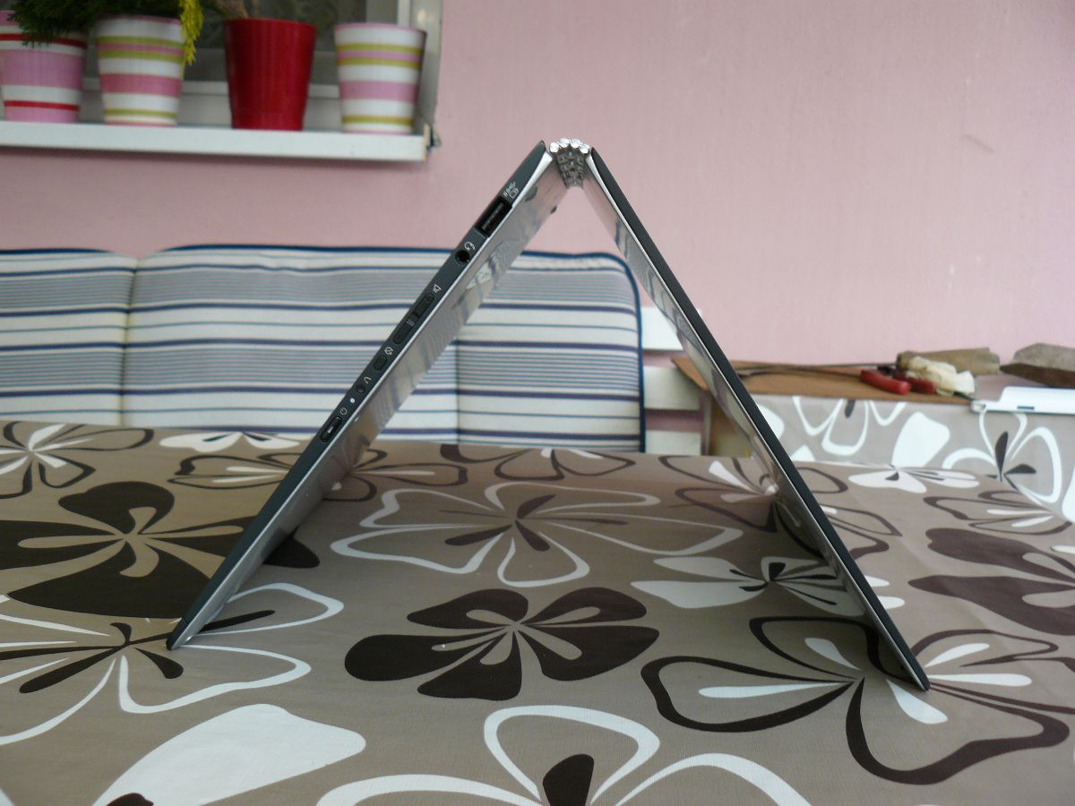 Vzhled je jednou z hlavních zbraní tohoto ultrabooku. Vnější strany jsou kryty hliníkovými plechy. Ty mohou mít stříbrné, vínově červené nebo jasně oranžové lakování. Unikátní kloub je pak vždy stříbrný. S testovanou stříbrnou variantou tak dobře ladil a nijak zvlášť nenarušoval design přístroje. V kombinaci s červenou či oranžovou však na někoho může působit jako pěst na oko. Vnitřku notebooku pak dominují tmavé povrchy. Okolí klávesnice je tvořeno pogumovaným plastem s důlkovaným povrchem. Ten je na dotek velmi příjemný a notebook díky tomu při položení klávesnicí směrem dolů neklouže ani po hladkém povrchu. Hrany víka a základny jsou rovněž vybaveny protiskluzovým povrchem, zajišťujícím stabilitu v režimu stan.