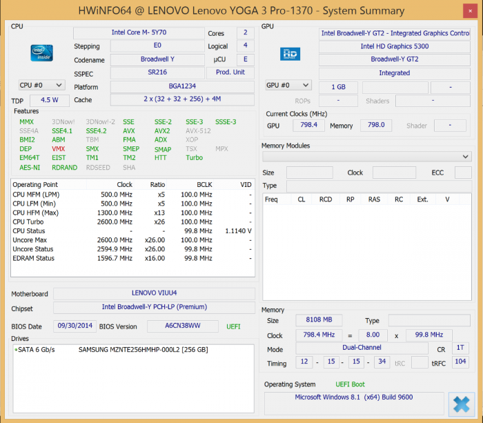 Notebook je vybaven zbrusu novým procesorem Intel Core M, konkrétně modelem 5Y70 s výchozím taktem 1,1 GHz. Procesor je díky nízkému TDP pouhých 4,5 W (běžně mají ultrabooky cpu s TDP 15 – 25W) určený především do pasivně chlazených tabletů. Procesor by měl mít výkon srovnatelný s minulou generací nízkonapěťových procesorů Core i5, použitých například v Yoze 2 (to však, přiznejme si, bude s největší pravděpodobností více či méně přibarvené marketingové tvrzení).
