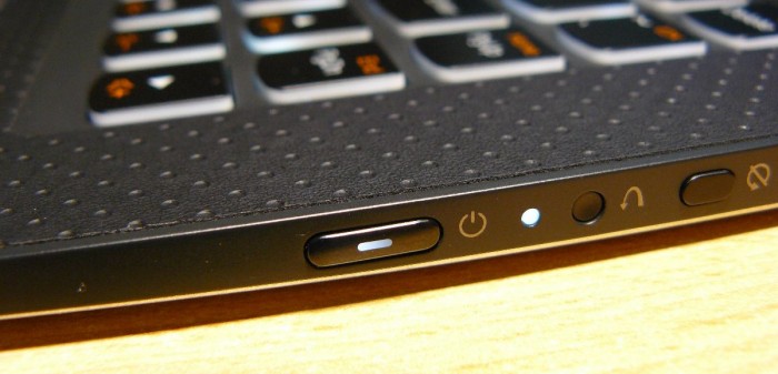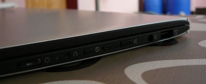 Veškerá tlačítka a indikační diody se nacházejí na pravém boku zařízení. Nalezneme zde tlačítka napájení, recovery, zámku otáčení displeje, a dvojici pro regulaci hlasitosti. Jedna dioda, signalizující zapnutý/uspaný notebook, se nalézá přímo v tlačítku napájení, druhá (a zároveň poslední) je hned vedle a signalizuje nabíjení notebooku. Tlačítko napájení je poměrně vystouplé a zároveň má velmi měkký stisk, nejednou se mi tak stalo, že jsem jej omylem stisknul a notebook tak nechtěně uspal.