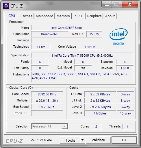 - Intel Core i7-5500U, 2,4-3,0 GHz (2 jádra, 4 vlákna, 4MB L3)