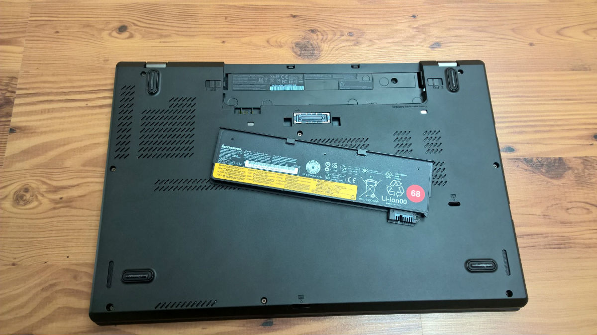 Vzhledem k tomu, že T550 vychází z menších ThinkPadů, zdědil po nich také velmi užitečnou vlastnost, tzv. Power Bridge. Oč se jedná? Uvnitř notebooku najdeme vestavěnou, uživatelsky nevyměnitelnou 3článkovou 44Wh baterii (v úrovni opěrek zápěstí). Ovšem na klasickém místě, na zadní straně mezi panty víka, najdeme šachtu pro běžnou, vyměnitelnou baterii, tu lze navíc vyměnit i za provozu. Sem můžeme osadit druhý 3článek (23 Wh), běžný 6článek (48 Wh), ale také rozšířený 6článek (72 Wh). V závislosti na kombinaci baterií Lenovo udává výdrž 14,8, 20 a 25,2 hodin.