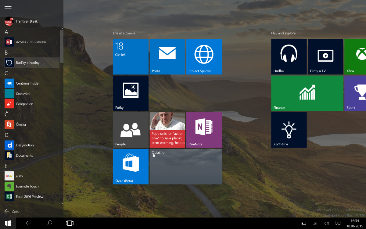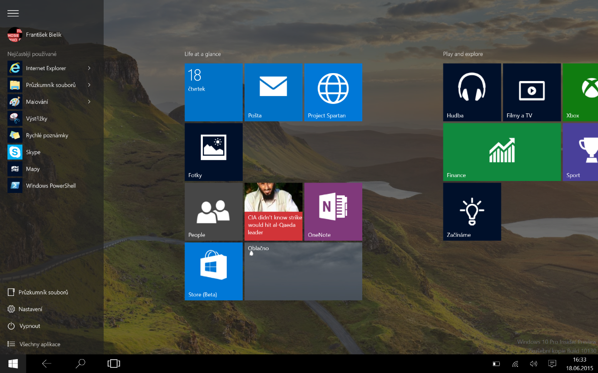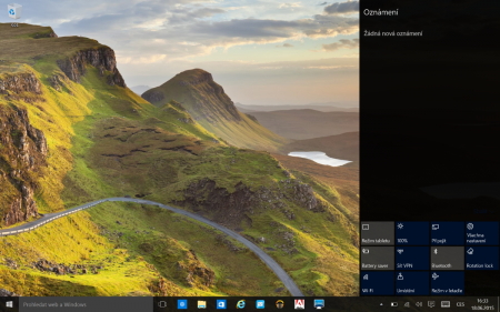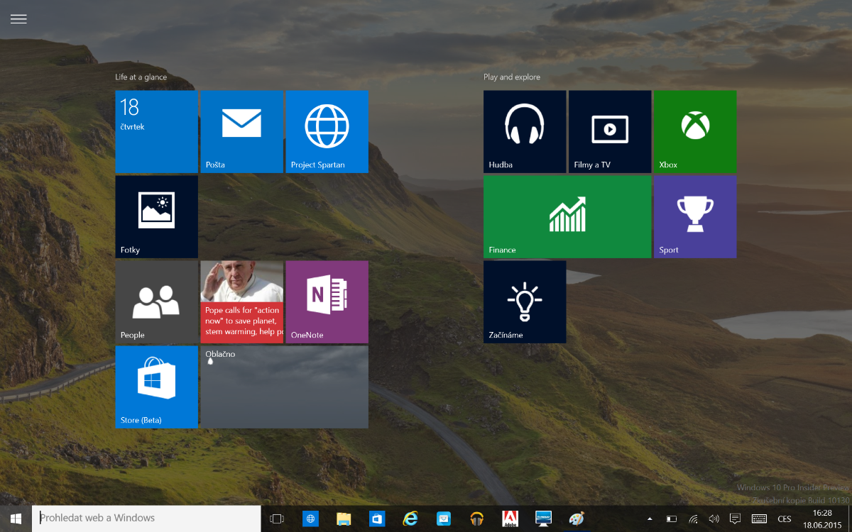 Jednou z nejzásadnějších proměn prošla nabídka start a také princip přepínání aplikací. Nabídka start se dá popsat jako dvě samostatné nabídky. V první naleznete totožné dlaždice jako u Windows 8.1 a navíc si můžete vyvolat na levé straně displeje přepracovanou a graficky sladěnou nabídku, kterou známe z Windows 7. Co se rychlého vyhledávání týče, měl jsem s ním problémy. Nejspíš se jednalo o bug, který se projevoval zkrátka tak, že ať už jsem zadal do vyhledávání cokoli, vyhledávání nabízelo pouze webový obsah a lokální zcela přehlíželo. Ve vyhledávání je také integrovaná skvělá asistentka Cortana, která jak to v našich končinách bývá zvykem, není vůbec lokalizovaná a na obzoru není ani malá jiskřička, že se toho někdy dočkáme. Zkrátka jsme nejspíš malý a nezajímavý trh. 10 milionů lidí mluvící jedním specifickým slovanským jazykem není natolik zajímavá a hravě se ztratí v miliardách anglicky, čínsky, francouzsky a španělsky mluvících potenciálních zákazníků.