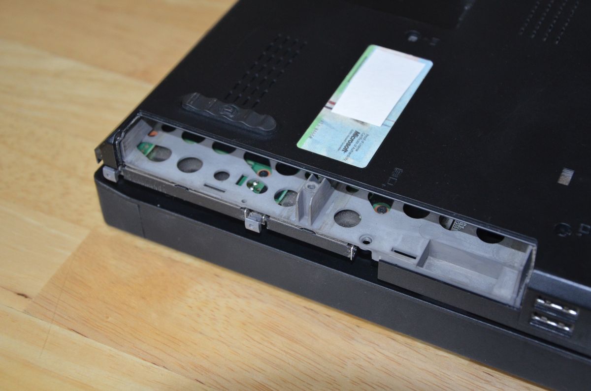 - pravá strana: trojice USB 2.0, RJ-11 (modem), zdířka pro stylus, DVD mechanika (šachta Serial UltraBay Enhanced) a zdířku zámku kensington